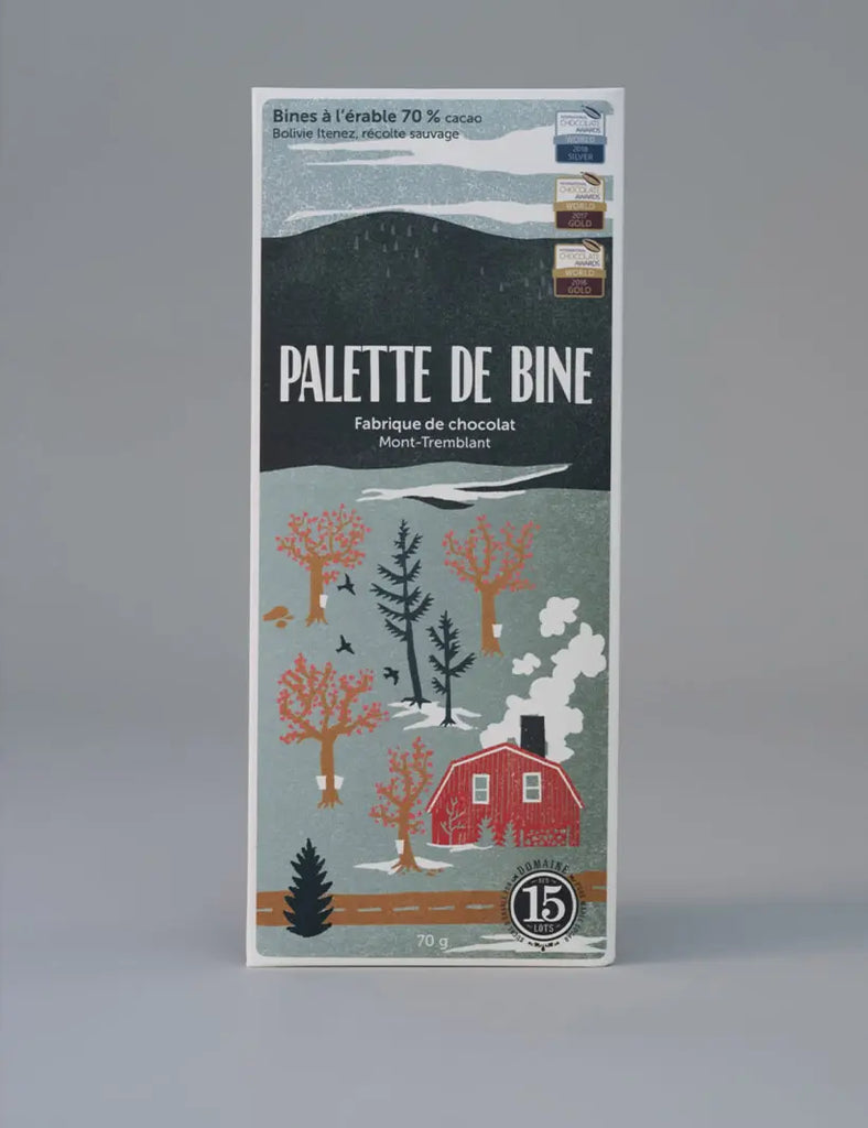 Architecte de métier et maintenant chocolatière reconnue, Christine Blais a fondé Palettes de Bine pour offrir du chocolat raffiné, à l’image de ses valeurs. Le chocolat de Palette de Bine est produit en petites quantités, en respectant la qualité de l’ingrédient, la “bine” de cacao. Celles-ci sont choisies auprès de producteurs indépendants provenant de partout à travers le monde. Le cacao est torréfié, broyé, conché, vieilli, tempéré, moulé et emballé à la main. Fondé à Mont-Tremblant.