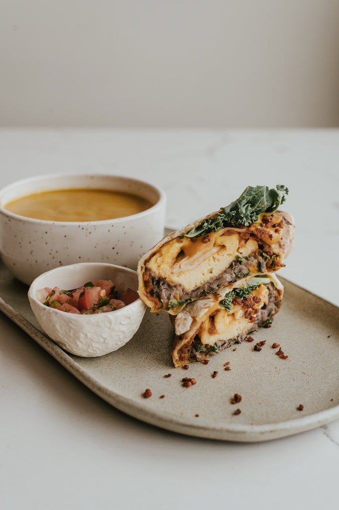 Tortilla, Omelette végétale, Queso végane, Chorizo végane maison, purée d’haricot noir, Kale et Mayo Chipotle. Accompagné d’un Pico de Gallo maison