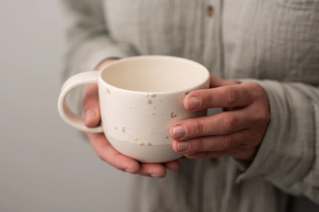 Chaque tasse est unique et présente un motif ludique de confettis colorés. La forme de l'anse assure une prise confortable et ajoute une rondeur agréable au design de la tasse.