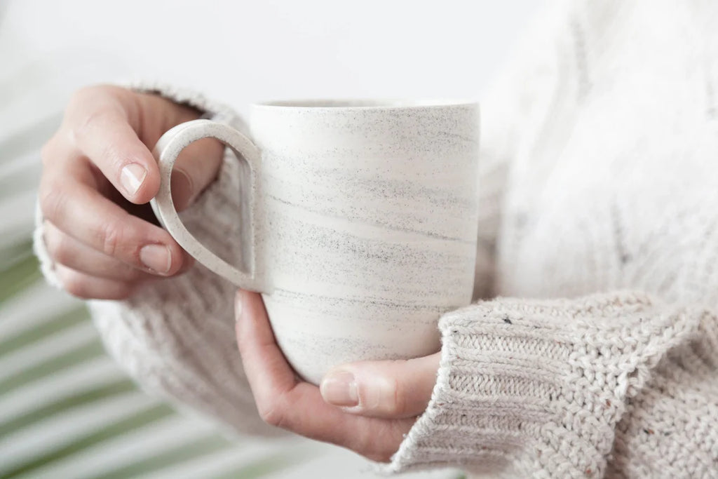 L'intérieur et l'anse du mug sont recouverts de glaçure, l'extérieur est mat (non émaillé).